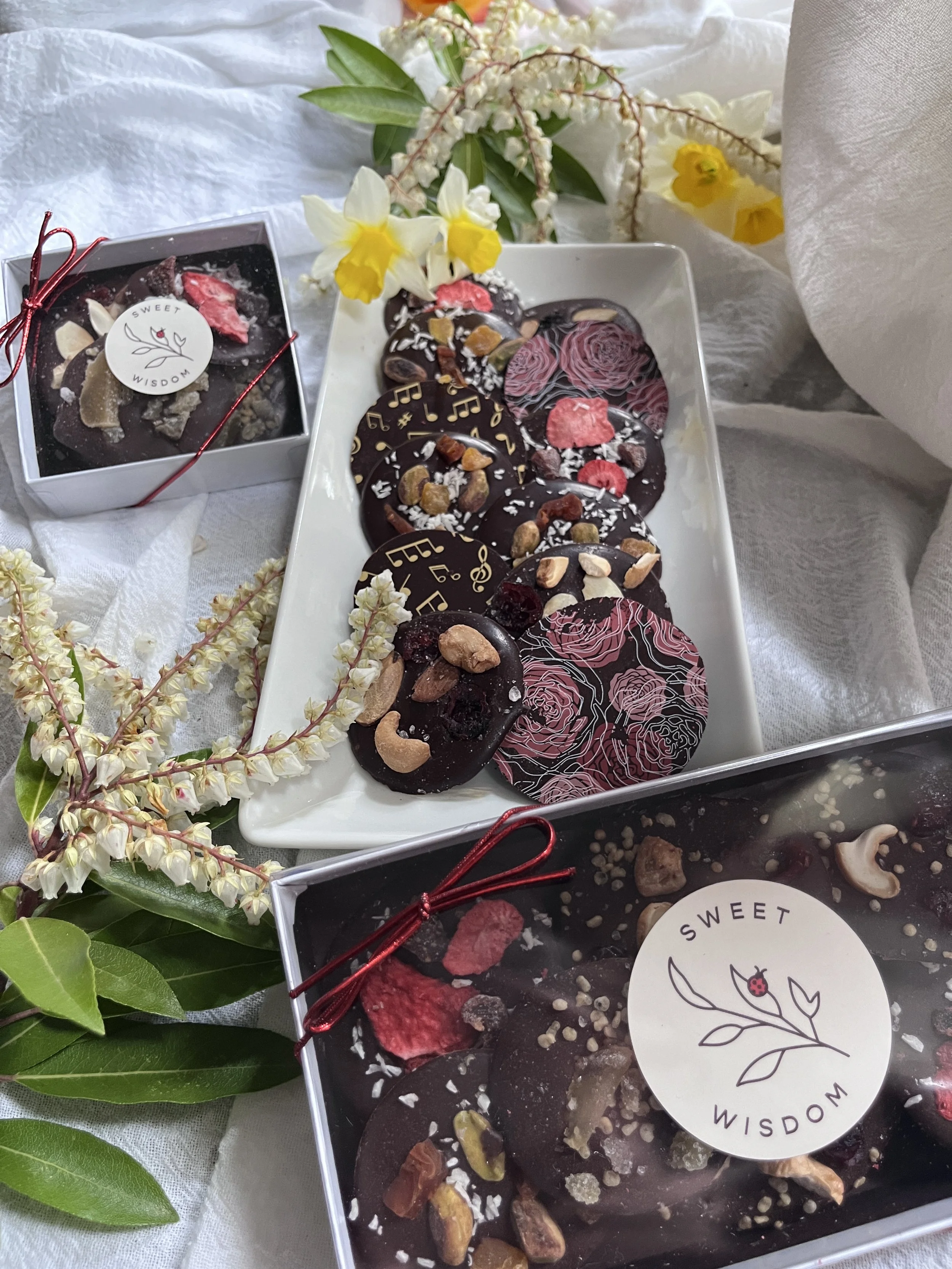 Hand crafted, without the use of cane sugar or preservatives, our chocolates offer an array of nature and plant-inspired flavors to enhance and uplift your well-being:
